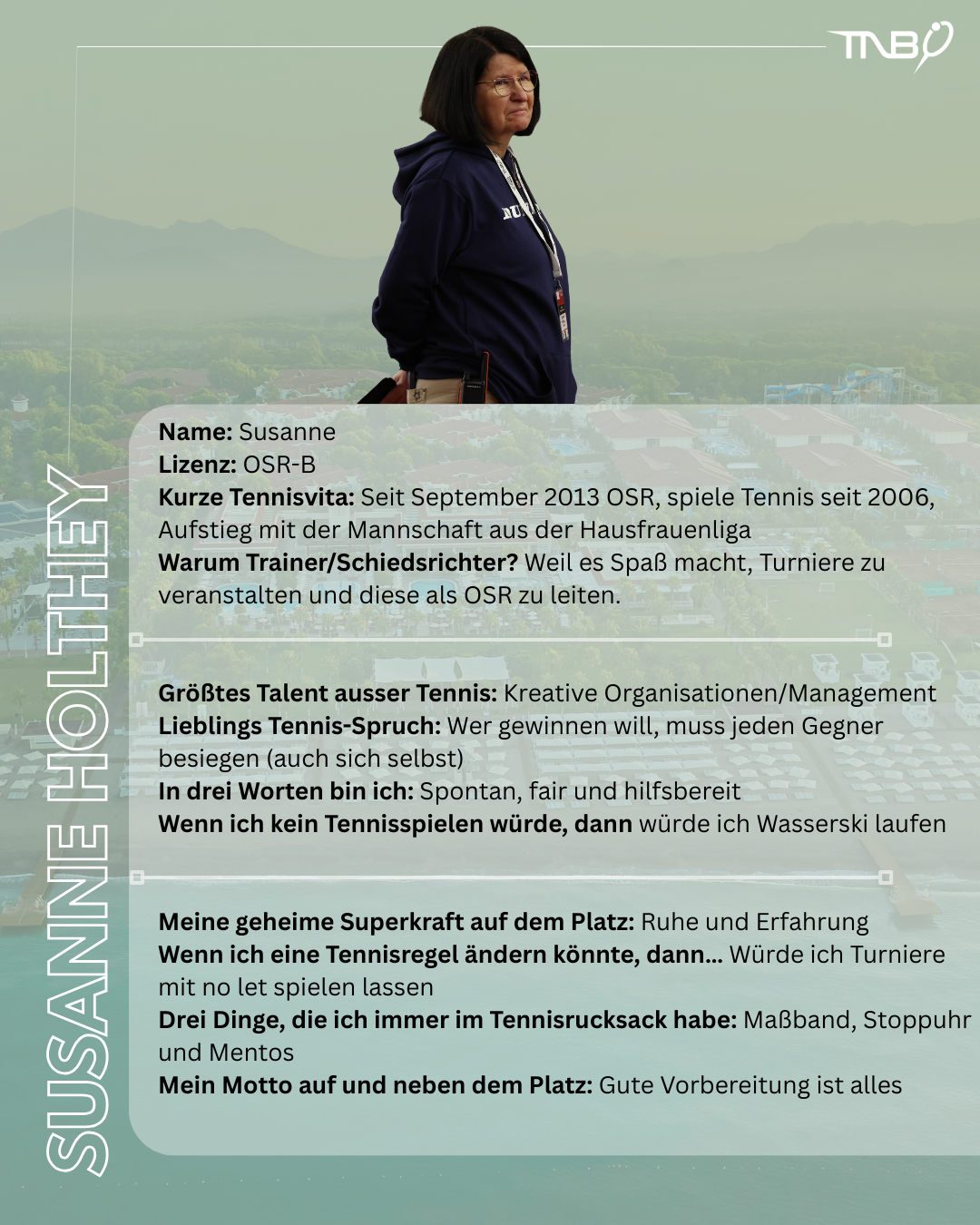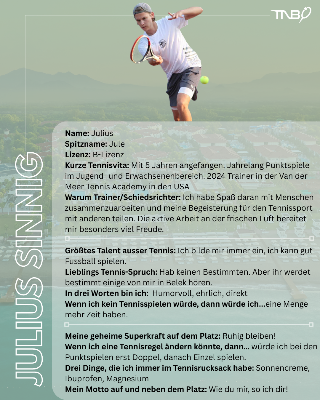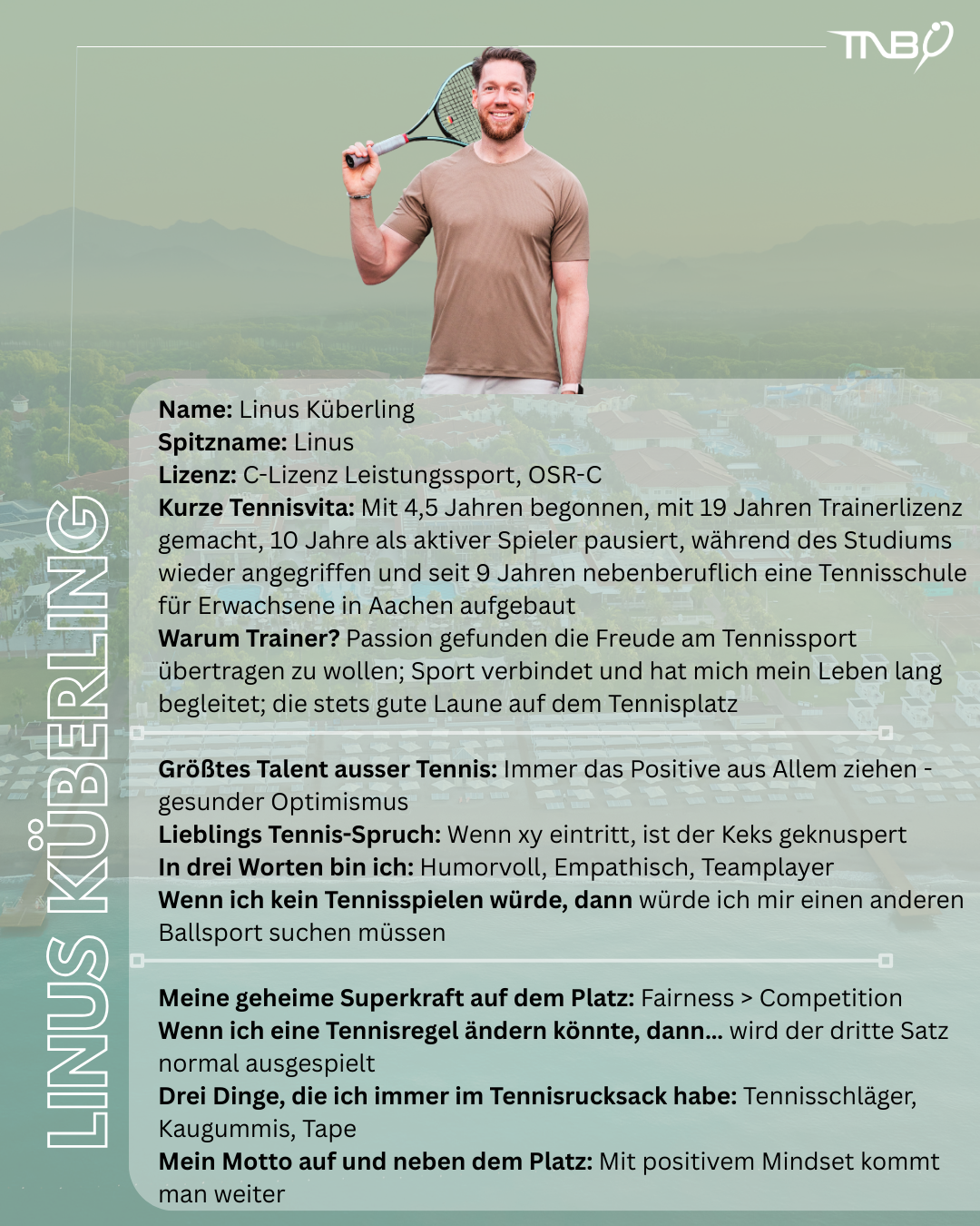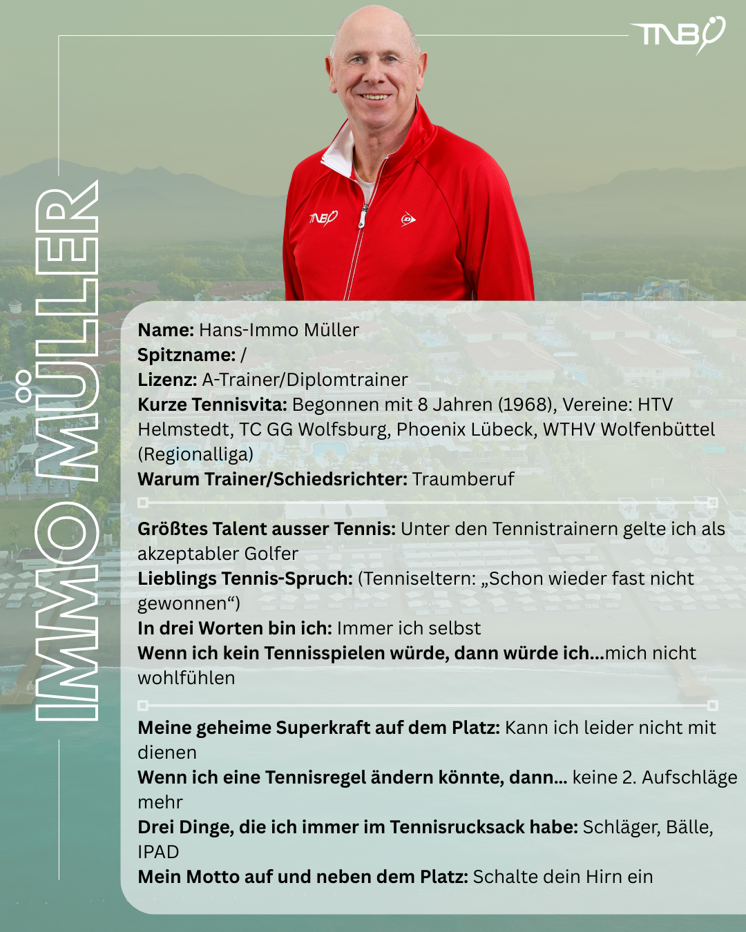 Das LK-Camp des TNB in Belek (Türkei) macht Lust auf Sonne, Sandplatz und Spielpraxis. Mit Immo Müller, Julius Sinnig und Linus Küberling als Trainer und Susanne Holthey als erfahrene Turnierleitung ist ein super Team vor Ort. Wir stellen sie hier für euch vor.