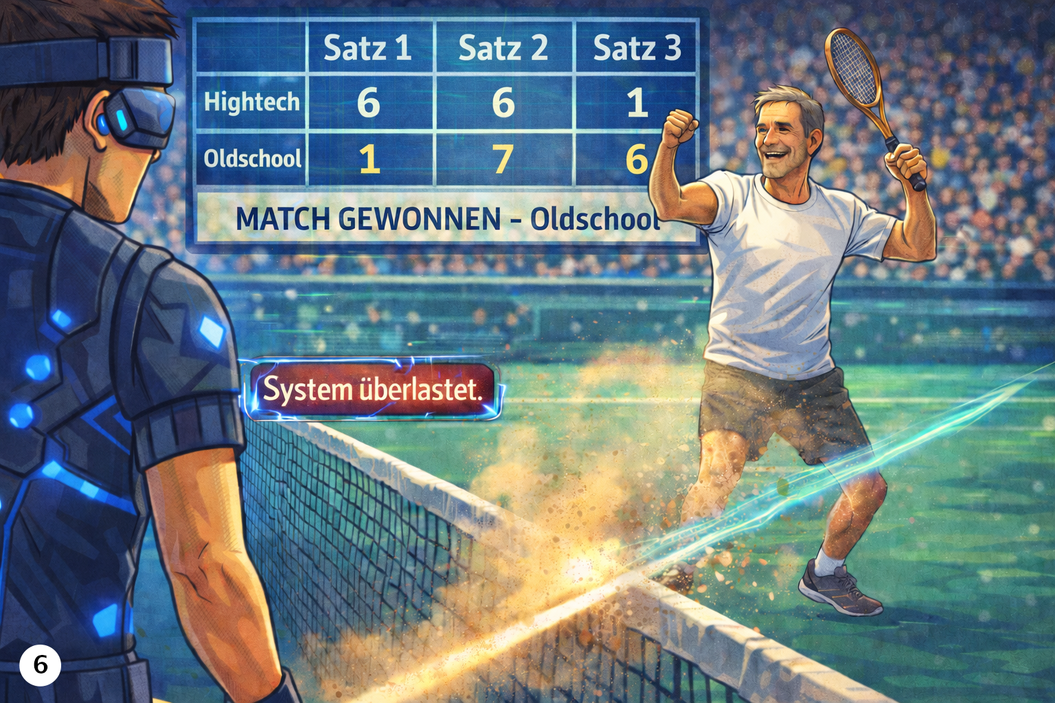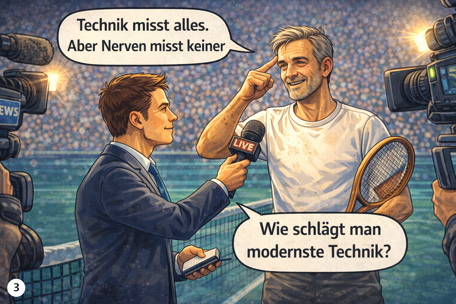 Der Außenseiter ohne Sensoren verliert den ersten Satz klar, kämpft sich im Tiebreak zurück und dreht im dritten komplett auf. Während beim Gegner das System „überlastet“ meldet, bleibt einer ganz entspannt – und zeigt, was Tennis wirklich entscheidet: Fokus, Mut und Nervenstärke.